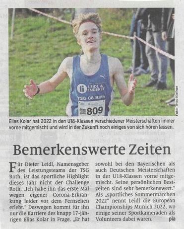 Nürnberg - Amberg - 31.12.2022 - Bei einigen der zahlreichen Silvesterläufe waren auch Aktive des Teams Leidl der TSG 08 Roth und der Triathlon-Abteilung vertreten. So beim Wettbewerb in Nürnberg über fünf Kilometer. Hierbei war Luis Höra besonders erfolgreich, der mit der Zeit von 15:57 Minuten nicht nur seine Altersklasse MU18 gewann, sondern schon als Gesamtzweiter die Ziellinie übertrat. Ebenfalls einen Podestplatz als Zweite der WU20 erzielte Lea Marie Bott in 29:12 Minuten. Jeweils als Vierte verfehlten Micha Grosch bei der Wertung der Männer mit 16:38 Minuten und Elaine Degen bei den Frauen mit 23:54 Minuten den Rang auf dem Podest, Elias Knoll wurde bei den Männern Sechster in 17:32 Minuten.