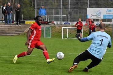 In einem unterhaltsamen Duell mit einigen Tormöglichkeiten brachte John Amadi unsere Elf nach einer halben Stunde mit seinem vierten Saisontreffer in Führung. Zu einem unglücklichen Zeitpunkt, deshalb aber nicht unverdient, glich die zweite Mannschaft der Spielgemeinschaft der beiden Vereine DJK Schwabach und SV Penzendorf in der Nachspielzeit der ersten Hälfte zum 1:1-Pausenstand aus.