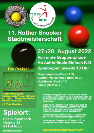 Die Rother Snooker Stadtmeisterstaft geht in eine neue Runde. Am 27./28. August 2022 beginnt die Stadtmeisterschaft. Jeder darf am Turnier teilnehmen. Je mehr Teilnehmer, je mehr Spaß. Ideal auch fpr Leute, die noch nie unter Turnierbedingungen Billard gespielt haben. Man muss kein Startgeld zahlen, also man kann nur gewinnen!