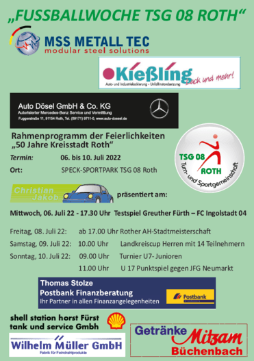 Der Landkreis Roth und die Kreisstadt Roth feiern heuer 50-jähriges Jubiläum, da dachten wir uns, wir feiern auch mit. Vom 6. bis zum 10. Juli laden die TSG-Fußballer zu ihrer Fußballwoche in den Speck Sportpark!