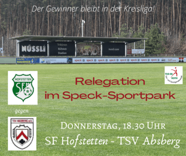 Am Donnerstagabend dürfen sich die Fußballfans in der Region auf einen packenden Relegationsabend im Speck Sportpark einstellen. Die SF Hofstetten und der TSV Absberg - Fussballabteilung kämpfen um den Klassenerhalt in der Kreisliga. Sowohl im Hilpoltsteiner Ortsteil wie auch am Kleinen Brombachsee hoffen sie auf große Unterstützung aus den eigenen Fan-Lagern, die Fußballabteilung der TSG 08 freut sich auf eine schöne Kulisse und wird sich bemühen, ein guter Gastgeber zu sein!