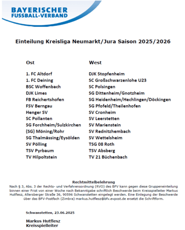 Ende Juli geht es dann mit der Gruppenrunde im Totopokal auf Kreisebene weiter, ehe am ersten August-Wochenende die neue Saison 2025/26 im BFV Kreis Neumarkt / Jura beginnt. Die Einteilung der Kreisligen ist mittlerweile bekannt, siehe angehängtes Foto.