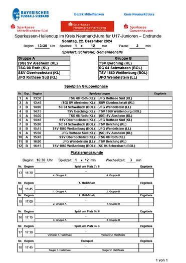 Turnierbeginn ist um 16.30 Uhr in der Brombachhalle, Gegner sind die SF Hofstetten, die SG Ramsberg/St. Veit, Türk Spor Freystadt und der VfB Markt Mörnsheim. Die Sieger und die drei besten Zweiten der fünf Vorrundengruppen qualifizieren sich für die Endrunde am 11. Januar in Wendelstein.