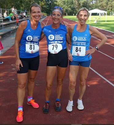 Eine makellose Bilanz legten die drei Frauen des Leidl-Teams vor, die ganz auf Sieg eingestellt waren. Bei der hochsommerlichen Temperatur teilten sich Susen Kunstmann und Michaela Jilg gemeinsam das Rennen über 3000 Meter gut ein und passierten fast zeitgleich das Ziel. In 11:51,6 Minuten wurde Susen Kunstmann Erste der Wertung W40, mit dem Hauch einer Zehntelsekunde folgte Michaela Jilg als Siegern der Klasse W50, und mit Brigitte Rupp (W60, 13:06,15 Minuten) vervollständigte das Trio die Siegplätze über diese Distanz Einen weiteren ersten Rang fügte Michaela Jilg über 800 Meter hinzu, die zwei Stadionrunden legte sie in 2:42,0 Minuten zurück.