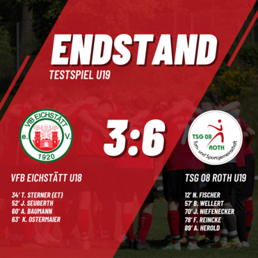 Am Sonntag hat unsere A-Jugend ihr zweites Testspiel in der Vorbereitung auf die neue Bezirksoberliga-Saison bestritten. Nach dem 5:1 (3:1)-Sieg in der Vorwoche gegen die JFG Rothsee Süd konnten unsere Jungs gegen die U18 des VfB Eichstätt einen weiteren Sieg einfahren. Die Elf der Trainer Markus Stuhr und Frank Reincke gewann mit 6:3 (2:0).