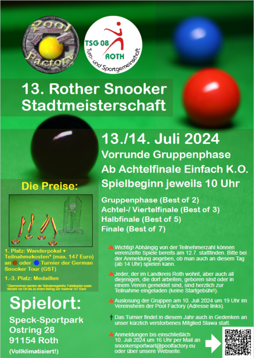 Bereit für die 13. Rother Snooker Stadtmeisterschaft am 13./14. Juli 2024 bei uns im SPECK-Sportpark?
