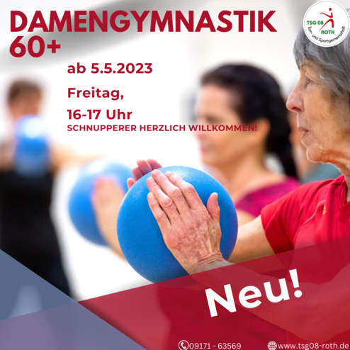 Ab dem 5.5.2023 bieten wir eine zusätzliche Stunde "Damengymnastik 60+" an! Es erwartet Sie ein abwechslungsreiches und gesundes Fitnesstraining von Kopf bis Fuß, bei dem Spaß und Freude an der Bewegung im Vordergrund steht. Ziel ist es die Gesundheit zu fördern und sich fit zu halten. Nach Übungen zur Kräftigung, Beweglichkeit und Koordination runden Dehn- und Entspannungsübungen das Programm ab.