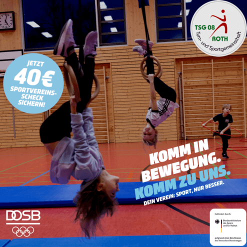 Jetzt der TSG beitreten und 40€ sparen! Denn die 40€ gibt es momentan für dich als Förderung auf deinen Mitgliedsbeitrag als Neumitglied bei der TSG 08 Roth. Die Aktion des DOSB und BMI ist vom 24.01. bis zum 31.08. gültig und auf 150.000 Gutscheine begrenzt. Also schnell sein und Scheck abholen. Den Scheck müsst ihr gemeinsam mit eurem Mitgliedsantrag abgeben. Den Mitgliedsantrag findet ihr hier