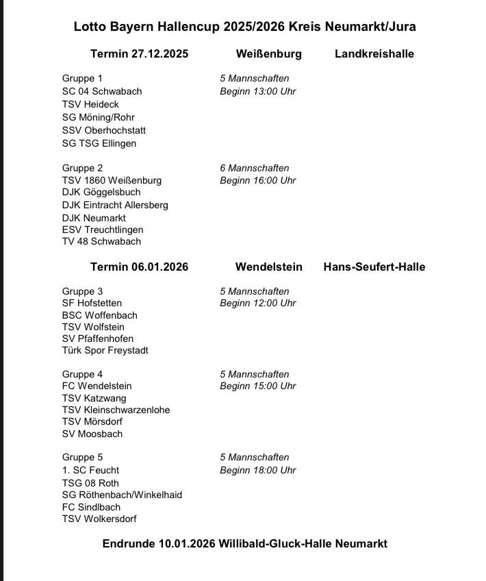 Mittlerweile sind auch die Gruppen eingeteilt, unsere Jungs spielen ab 18 Uhr in der Gruppe fünf gegen den SC Feucht, die SG Röthenbach/Winkelhaid, den FC Sindlbach und den TSV Wolkersdorf um den Einzug in die HKM-Endrunde. Die geht am 10. Januar in Neumarkt über die Bühne.