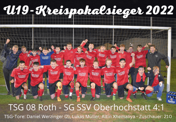 U19, Kreisliga West, TSG 08 Roth - SG Gunzenhausen 10:0 (4:0) - Zum Spiel eins nach dem Pokalsieg der U19 kam am vergangenen Sonntag die SG Gunzenhausen in den Speck-Sportpark. Die Jungs hatten sich viel vorgenommen und wollten trotz des Eindrucks des Pokalerfolges wieder 100 Prozent Engagement zeigen. So ging es von Beginn an auch nur in eine Richtung und bereits in den ersten Minuten erspielten sie sich beste Tormöglichkeiten.Allein die Chancenverwertung ließ zu wünschen übrig. In der 18. war es dann so weit. Daniel Werzinger eröffnete mit dem 1:0 den Torreigen. Philipp Gräfensteiner mit seinem Doppelpack (27., 33.) und erneut Daniel Werzinger (36.) sorgten für den 4:0 Halbzeitstand. Hochkonzentriert und mit hohem Tempo ging es in die zweite Hälfte und wieder war es Daniel Werzinger, der mit seinem drittenTreffer auf 5:0 erhöhen konnte (52.). Der Gegner hatte zwar ein paar gute Aktionen, ohne dadurch aber dem Spiel eine Wende geben zu können. So kam es zu weiteren sehr sehenswerten Angriffsaktionen und Toren durch Pascal Bierlein (6:0, 58.), Altin Xhemaliya (7:0, 68.), und Steffen Winterhager (8:0, 74.) Für den Abschluss sorgte dann Marlin Strobel mit seinem Doppelpack zum 9:0 und 10:0 in der 84. und 90. Minute. Ein auch in dieser Höhe verdienter Erfolg, dank der überragenden Mentalität des Teams!