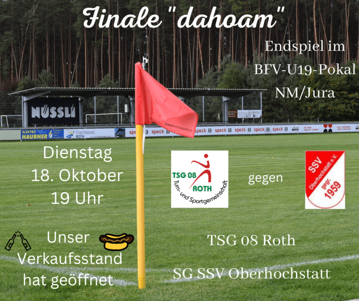 Das Finale im Verbandspokal NM/Jura der A-Junioren findet am morgigen Dienstag, 18. Oktober, bei uns im Speck Sportpark statt. Um 19 Uhr ist Anpfiff zwischen unserer TSG-U19 und der SG SSV Oberhochstatt. Im Halbfinale unter der Woche setzte sich Roth bei der SG FC Plankstetten mit 7:2 durch, Oberhochstatt gewann mit 4:2 bei der SG FC Gunzenhausen. Beide Mannschaften sind Konkurrenten in der U19-Kreisliga West, das erste Duell Anfang Oktober gewann die TSG 08 daheim gegen Oberhochstatt mit 5:1. Aber im Pokal gelten ja bekanntlich eigene Gesetze...