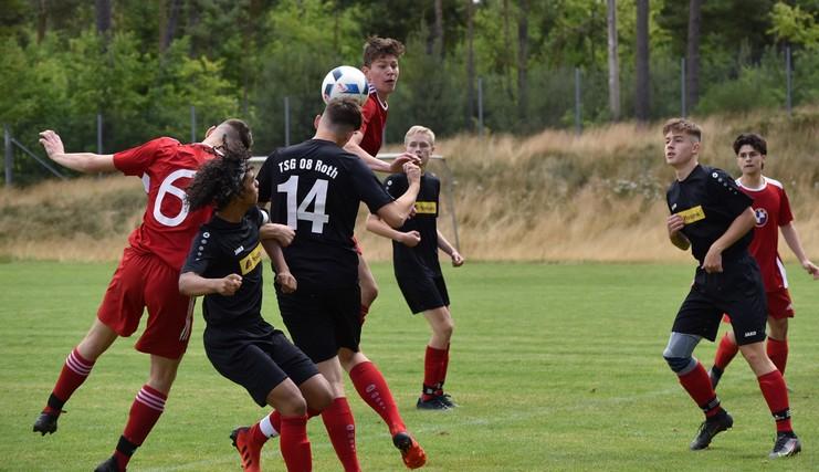 Kreisliga Süd, TSG 08 Roth – JFG Neumarkt 1:7 (1:4) – Völlig auf dem falschen Fuß hat die JFG Neumarkt unsere B-Junioren im abschließenden Gipfeltreffen der Kreisliga erwischt. Schon nach wenigen Sekunden trafen die Oberpfälzer zum 1:0 und legten nach nicht einmal fünf Minuten zum 2:0 nach. Damit waren freilich sämtliche Überlegungen der Trainer Jürgen Wellert und Frank Reincke über den Haufen geworfen und die Meisterschaftshoffnungen so gut wie dahin. Weil die Neumarkter auch nicht nachließen, Nils Fischer traf per Freistoß zum zwischenzeitlichen 1:4, am Ende siegten die Gäste klar mit 7:1 und durften sich über die Meisterschaft in der Kreisliga Süd freuen. Glückwunsch nach Neumarkt und Kopf hoch an unsere Jungs!