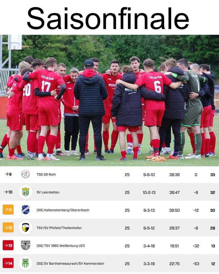 ...wenn sie gegen Dittenheim/Gnotzheim verlieren, Leerstetten gegen Weißenburg unentschieden spielt und Kalbensteinberg/Obererlbach in Absberg gewinnt. Dann kommen alle drei Mannschaften mit 33 Punkten ins Ziel, die dann nötige Sondertabelle aus den direkten Vergleichen der drei Mannschaften würde Leerstetten auf Platz eins, Kalbensteinberg/Obererlbach auf Rang zwei und unsere Jungs auf Platz drei ausweisen.