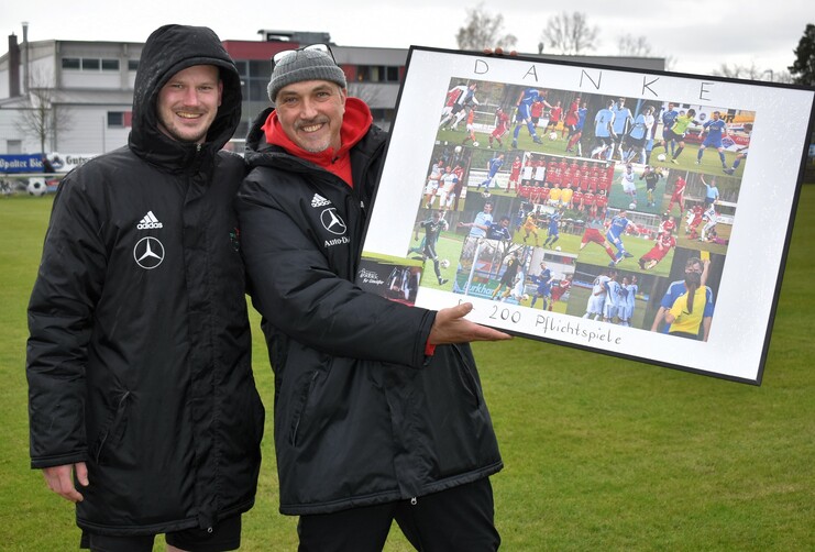 Nach dem Spiel „seiner“ Reserve gegen den TSV Rohr und vor dem Derby der Ersten gegen den TV Eckersmühlen wurde Müller für sein 200. Pflichtspiel in unserem Trikot ausgezeichnet und bekam von Spielleiter Werner Fischer unter anderem eine Bild-Collage aus den vergangenen Jahren überreicht.