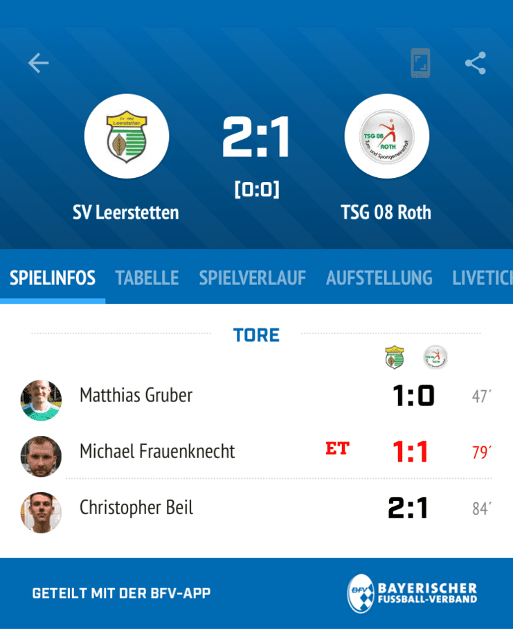 Niederlage zum Abschluss der Hinrunde: Unsere erste Mannschaft verlor am Sonntagnachmittag das Verfolgerduell beim SV Leerstetten mit 1:2 (0:0). Kurz nach der Pause musste die Berner-Elf den Rückstand hinnehmen, nach einer Standardsituation glückte eine Viertelstunde vor dem Ende aber der Ausgleich: Einen Freistoß von Sebastian Weiß lenkte der Ex-Rother Michi Frauenknecht ins eigene Tor. Doch diesmal sollte es nichts werden mit einem Punktgewinn für unsere Erste, Christopher Beil traf nach 84 Minuten zum Sieg für den SVL.