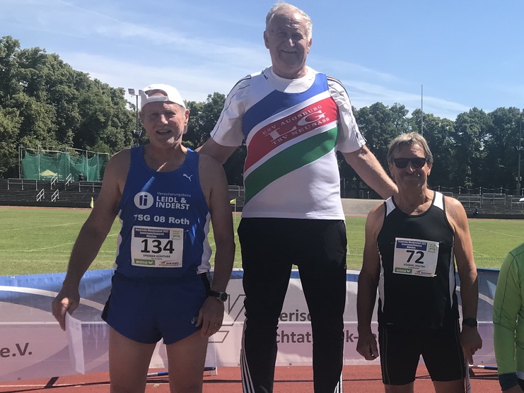 Am Sonntag den 17.Juli fanden die Meisterschaften der Werfer im traditionsreichen Dantestadion in München statt. Die äußeren Bedingungen waren ideal, es hatten sich viele Starter angemeldet. Günther Sperber vom Team Leidl der TSG 08 Roth erinnert sich an die Zeit vor 50 Jahren, als das Dantestadion wegen der neuen Tartanbahn auch für Mittelfranken für Starts sehr beliebt war. Nun allerdings startet er im Kugelstoßen und Diskuswerfen der 70jährigen und wurde Vizemeister mit der Kugel in 10,34m und erreichte den vierten Platz mit dem Diskus in 29,26m.