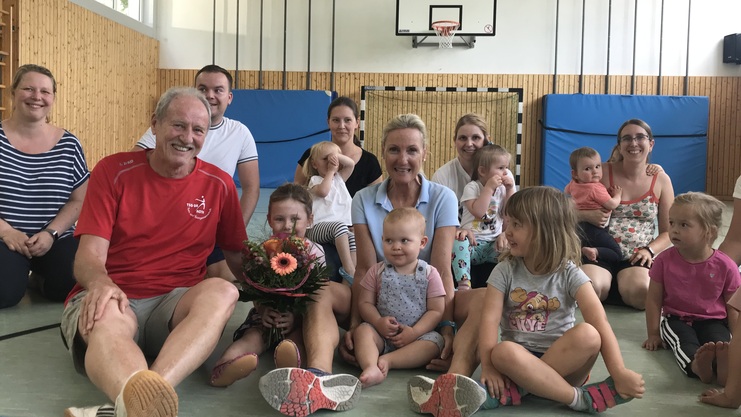 Bei ihrer letzten Eltern+Kind Stunde wurde Silvia Ingenthron von Abteilungsleiter Günther Sperber mit einem Blumenstrauß verabschiedet. Sie hatte mit viel Freude und Begeisterung 13 Jahre lang die Gruppen betreut und viele Jahrgänge von kleinen Kindern in ihrer Stunde gefördert und zusammen mit den Eltern mit Bewegungsaufgaben gefordert. Wir wünschen Silvia viel Erfolg mit ihren neuen Aufgaben und bedanken uns sehr herzlich für ihr langjähriges Engagement!
