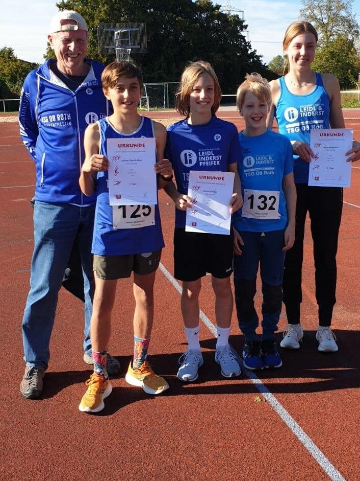 Für den Kreis Roth-Weißenburg starteten auch 3 Jungs und 3 Mädels der TSG 08 Roth. Trotz deren Anstrengungen konnte nicht verhindert werden, den 5. Platz in der Mannschaftswertung zu belegen. Für 4 Punkte sorgte Alicia Krogmeier im 800m-Lauf der U16 mit der sehr guten Zeit von 2:33,33 min. Ebenfalls über 800m lief Luisa Appel persönliche Bestzeit in der U14 mit 2:42,88min. Johann Oberfichtners Zeit von 2:38,36min reichte für Platz 4 in der U14, ebenso wie bei David Scholze mit 2:23,08min in der U16. David musste vorher auch die 100m in 14,35 und den Weitsprung in 4,27m absolvieren. Ophelia Herzig lief in der U14 über 75m 12,00 und warf den Ball für 2 Punkte 30,50m weit. Ebenso wie ihr Bruder Alvaro in der U16, startete sie in der Sprintstaffel, die 4 Punkte erreichte. Im Kugelstoßen erzielte Alvaro 6,59m.