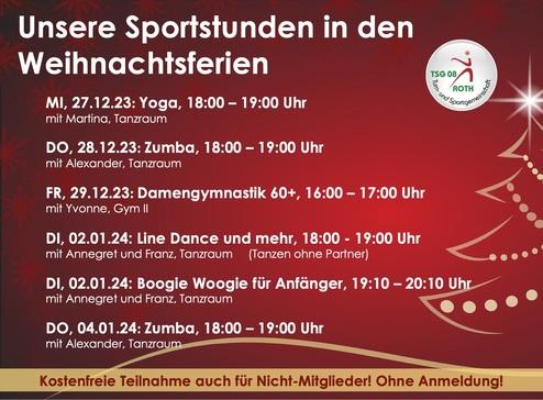 Startet entspannt mit einer Einheit Yoga, powert euch bei Zumba aus oder tut euch was gutes bei der Damengymnastik. Als besonderes Highlight bieten wir in diesem Jahr am 2. Januar zwei tolle Stunden unserer Boogie-Abteilung an: Line Dance und Boogie Woogie für Anfänger.
