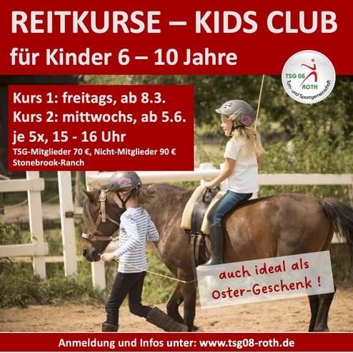 Alle Kinder von 6 bis 10 Jahren haben bei „Reiten Kids-Club“ die Möglichkeit, den Umgang mit Pferden zu lernen und erste Reiterfahrungen zu machen. Die Kurse werden in Kooperation mit der Stonebrook-Ranch angeboten.