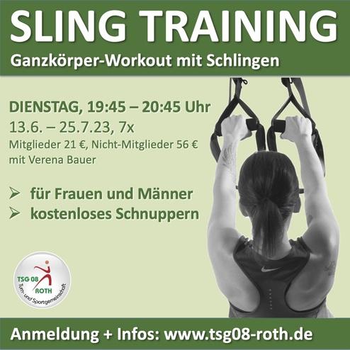 Sling Training ist ein Ganzkörper-Workout, bei dem das eigene Körpergewicht als Trainingswiderstand mit Einsatz eines unelastischen Gurt- und Seilsystems im Stehen, Liegen, Sitzen oder Knien zum Einsatz kommt. Somit wird ein Muskelaufbau erzielt und gleichzeitig auch Flexibilität, Gleichgewicht und Stabilität trainiert. Die Belastungsstufen können individuell, durch Veränderung der Körperposition zum Aufhängungspunkt, schnell und einfach geändert werden.