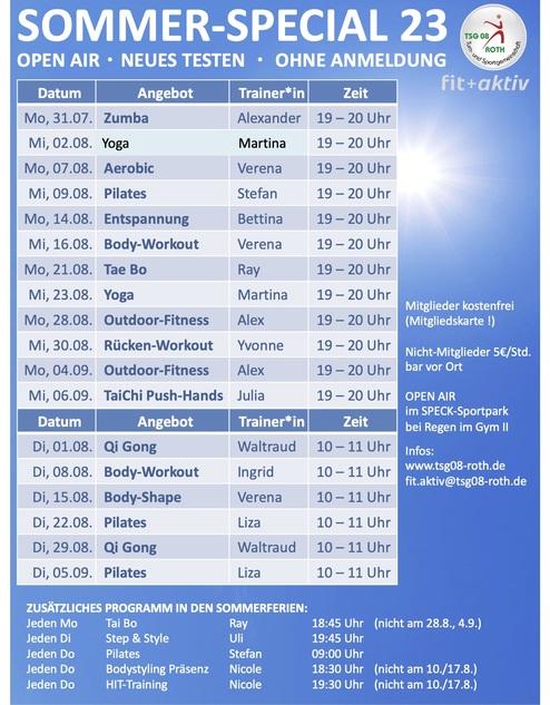 An 18 Terminen bieten wird eine Sportstunde aus unserem Angebot zum Kennenlernen aus. Das ganze ohne Voranmeldung und OPEN AIR in unserem schönen SPECK-Sportpark. TSG-Mitglieder können kostenfrei teilnehmen (bitte Mitgliedskarte vorzeigen, Nicht-Mitglieder zahlen 5 € bar vor Ort.