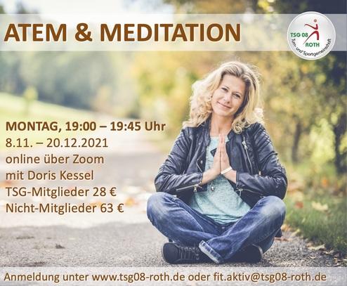 Im Kurs „Atem & Meditation“ werden verschiedene Atemtechniken gezeigt, die dabei helfen herunterzufahren, neue Energie aufzutanken und in Balance zu kommen. Gemeinsam tauchen die Teilnehmer in eine entspannte Innenwelt ein und meditieren zusammen. Der 7-teilige Kurs findet ab dem 8.11.21 jeden Montag von 19:00 – 19:45 Uhr online über Zoom statt.