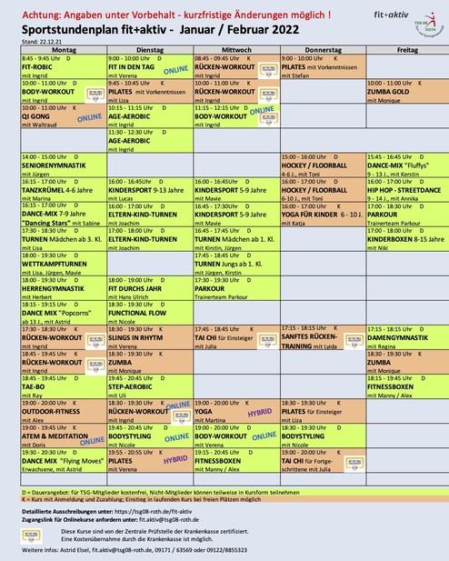 Ab dem 10. Januar starten wieder viele Sportangebote und Kurse des Sportbereichs fit+aktiv. Hier die Übersicht in Form eines Stundenplans. Eine Voranmeldung auch zu den Dauerangeboten ist aufgrund begrenzter Teilnehmerplätze sinnvoll (per Email an fit.aktiv@tsg08-roth.de)