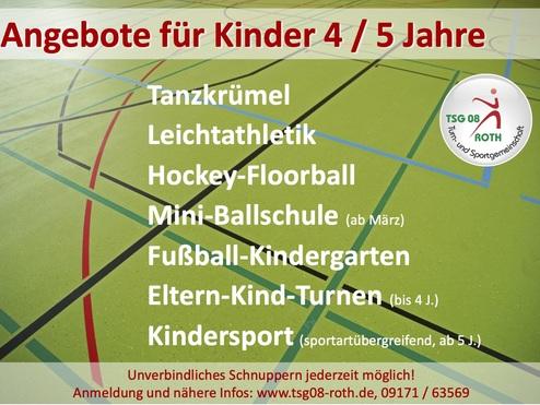 Mit dem neuen Schuljahr starten wieder viele Sportangebote für Kinder und Jugendliche bei der TSG 08 Roth. Auch einige neue Angebote sind im Programm: So gibt es ab dem 16.9.21 immer donnerstags um 15 Uhr Hockey-Floorball für Kindergartenkinder von vier bis sechs Jahren. Für Grundschulkinder von sechs bis zehn Jahren findet donnerstags um 16 Uhr Yoga für Grundschulkinder statt. Ab November startet Sing mit Felix für Kinder ab einem Jahr mit Eltern immer freitags um 9:30 Uhr.