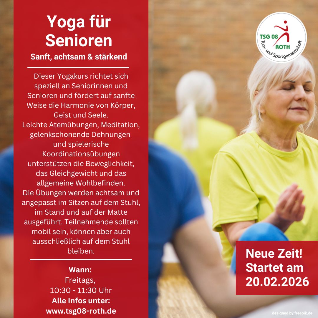 Dieser Yoga-Kurs richtet sich speziell an Seniorinnen und Senioren und fördert auf sanft Weise die Harmonie von Körper, Geist und Seele. Leichte Atemübungen, Meditation, gelenkschonende Dehnungen und spielerische Koordinationsübungen unterstützen die Beweglichkeit, das Gleichgewicht und das allgemeine Wohlbefinden. Die Übungen werden achtsam und angepasst im Sitzen auf dem Stuhl. im Stand und auf der Matte ausgeführt. teilnehmende sollten mobil sein, können aber auch ausschließlich auf dem Stuhl bleiben.